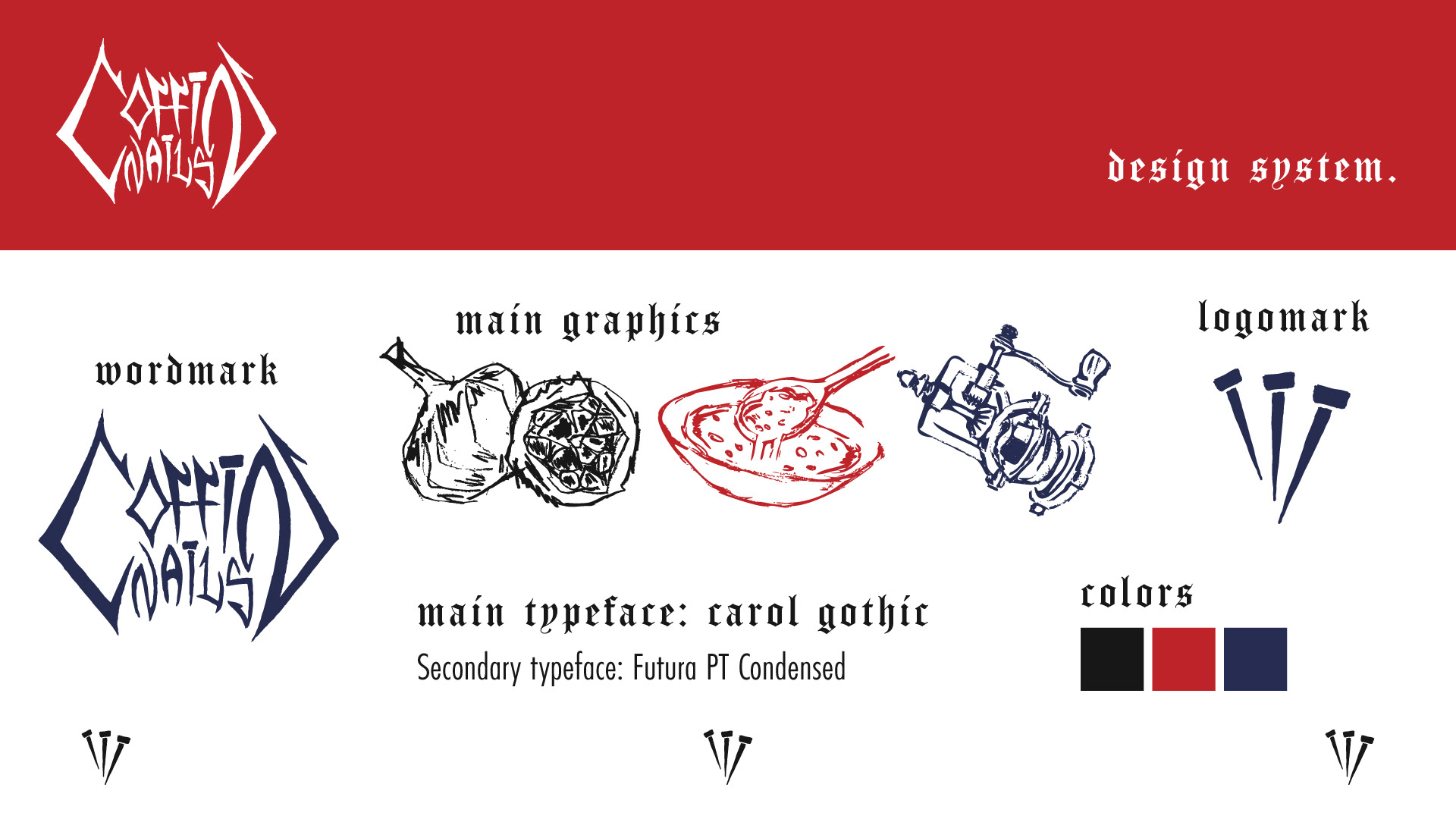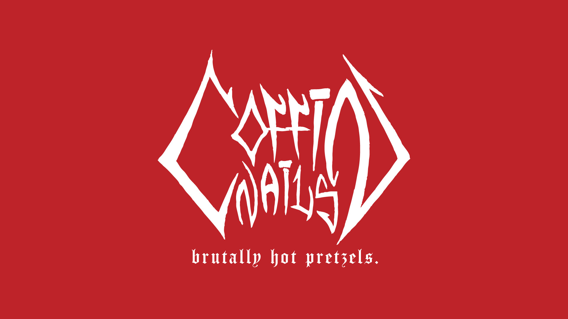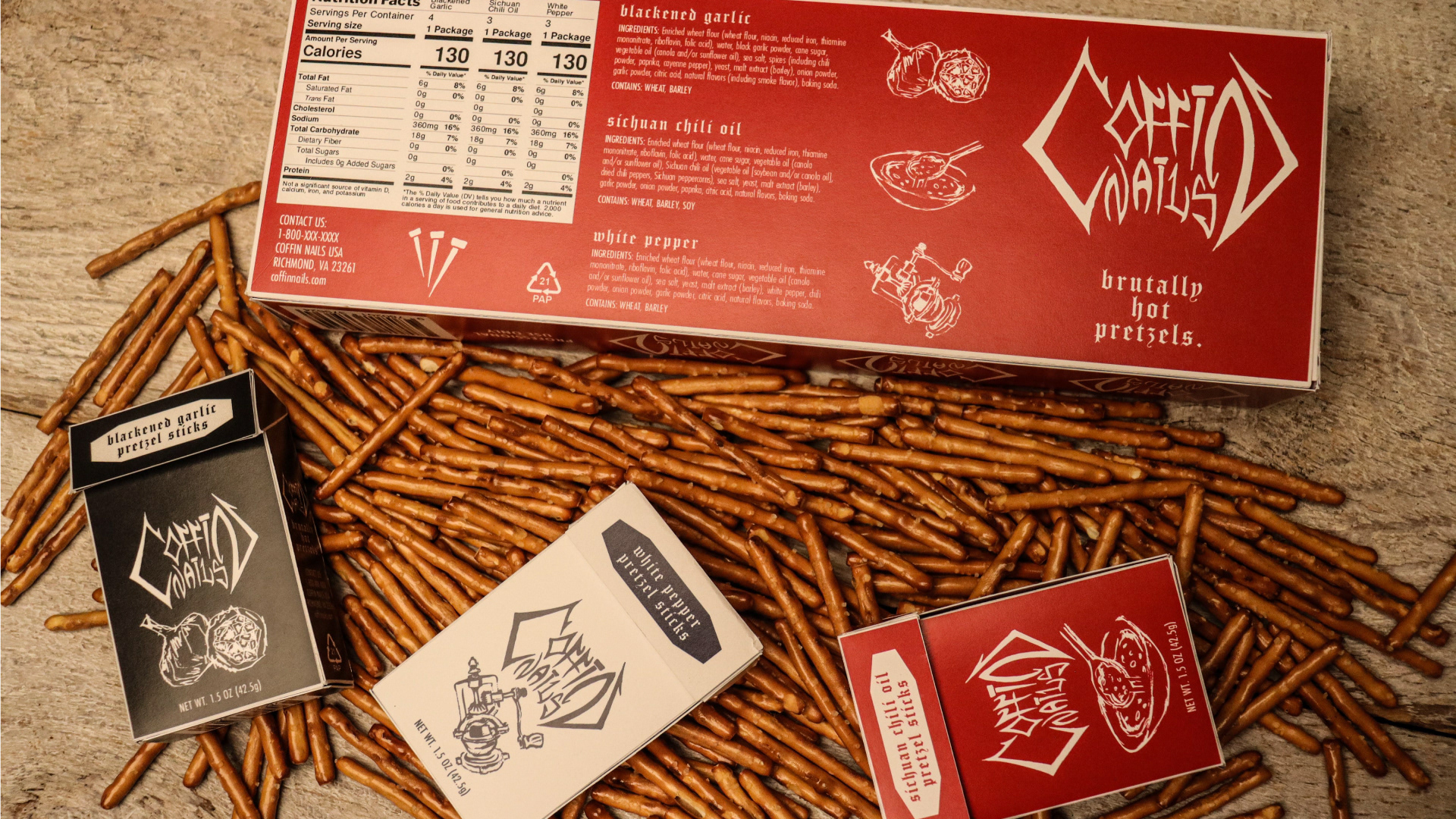 Coffin Nails is a branding and packaging project for a line of pretzels that I imagined. I repurposed the bold, propagandist conventions of cigarette packaging and the harsh, angular look of punk and metal design for a line of spicy gourmet pretzels aimed at fans of heavy music. This involved hand-drawing wordmarks, logomarks, and illustrations, determining a color palate, and laying out my package designs on dielines, following federal requirements for food packaging. After these were printed, I cut and assembled the packages, taking them into the shoot studio for product shots.